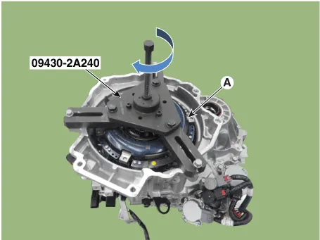 | 2. | Install the special service tool (09430-2A240) on the clutch housing side. Then, install the dual clutch assembly (A) by rotating the shaft of service tool.
