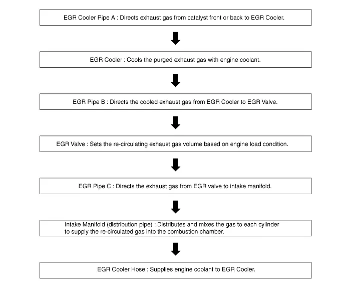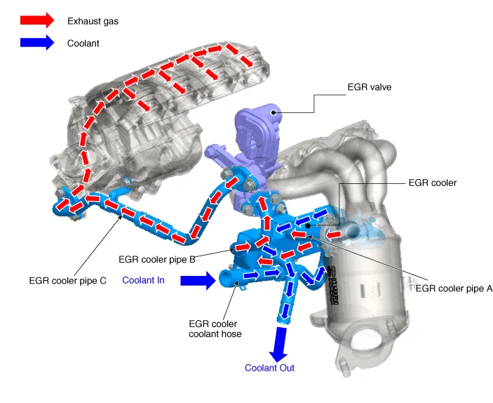 Components1. EGR cooler pipe C2. Electric EGR (EEGR) control valve3. EGR cooler4. EGR cooler pipe A5. Gasket6. EGR cooler pipe B