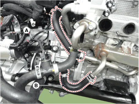 | 5. | Disconnect the EGR cooler hose (A) and EWP water hose (B).