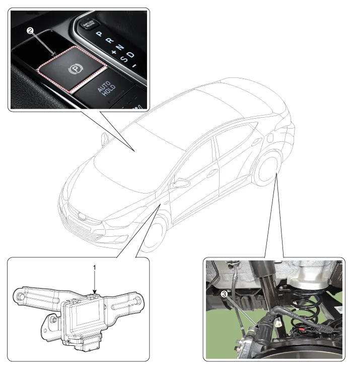 | 1. Electric parking brake comtrol module 2. EPB Switch | 3. EPB Actuator |