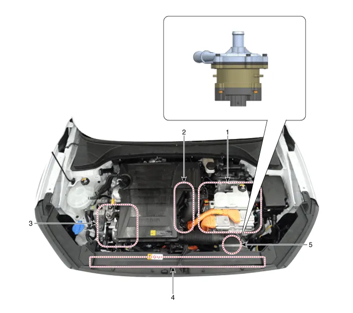| 1. HPCU (Hybrid Power Control Unit) (LDC+MCU+HCU+Reservoir) 2. Hybrid drive motor | 3. Hybrid starter generator (HSG) 4. Electrical radiator 5. Electric water pump (EWP) |