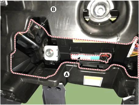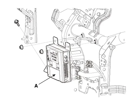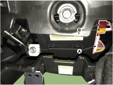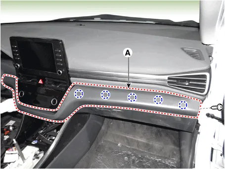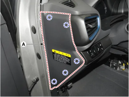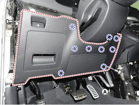 | 4. | Loosen the mounting screws and remove the crash pad lower panel (A).