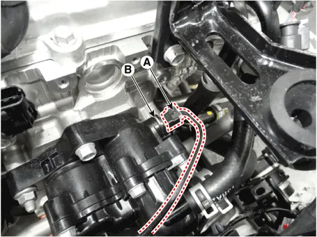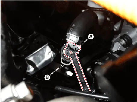 | 4. | Remove the engine coolant temperature sensor after removing the fixing pin (B).