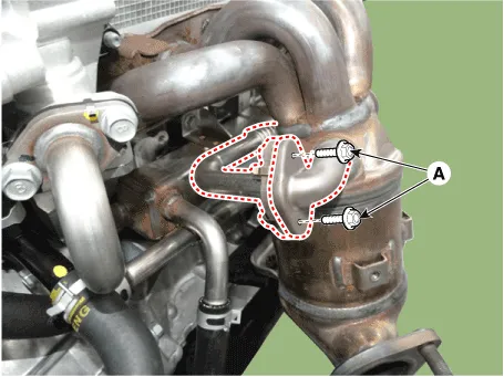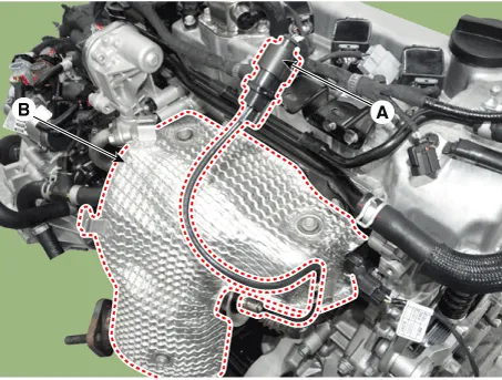 | 6. | Disconnect the oxygen sensor connector (A) from the connector bracket and then remove the heat protector (B).