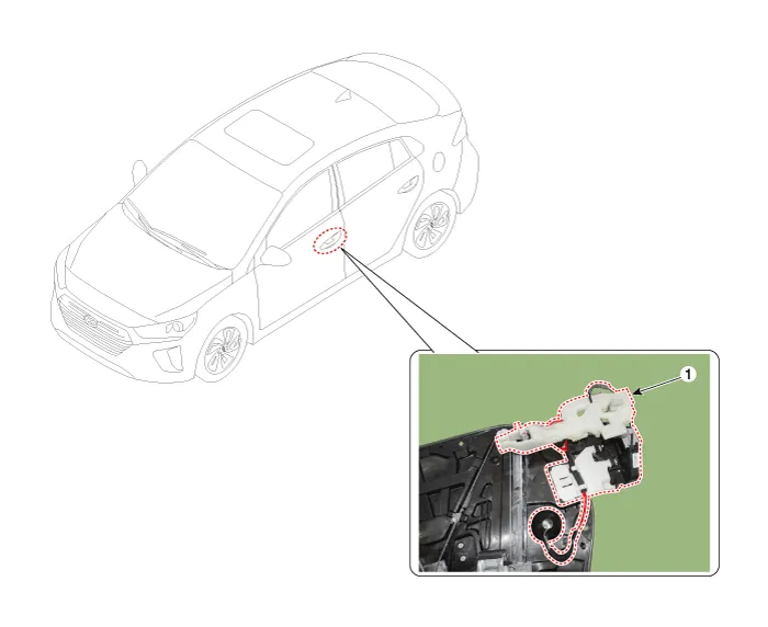 Replacement1.Remove the front door module.(Refer to Front Door - "Front Door Module")2.Remove the front door inside handle cage (A).3.Remove the front door latch assembly (A) by pulling it in the direction of the arrow.