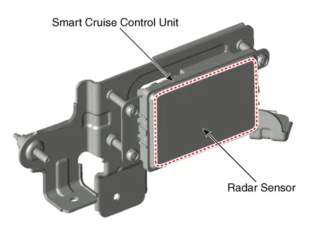 The smart cruise control unit is installed on the front right side of the chassis. A radar sensor is embedded in the front section of the unit. This sensor detects vehicles and objects in front of the vehicle. The radar sensor can detect up to 64 objects ahead of a vehicle. The alarm goes off when the vehicle deviates from the horizontal and vertical alignment reference points during operation. This sensor communicates with the dashboard, warning buzzer, smart cruise control switch, Electronic Stability Program (ESP), ECM, and TCM via CAN communication. The sensor controls vehicle speed through CAN communication between the Electronic Stability Program (ESP) system and the ECM and TCM.