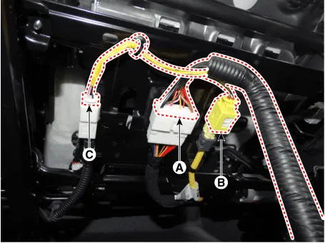 | 2. | Disconnect the main connector (A), front seat belt buckle connector (C), airbag connector (B).
