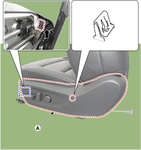 | 1. | Remove the front seat shield outer cover (A) by pulling forward in the direction of the arrow using screw driver or remover.