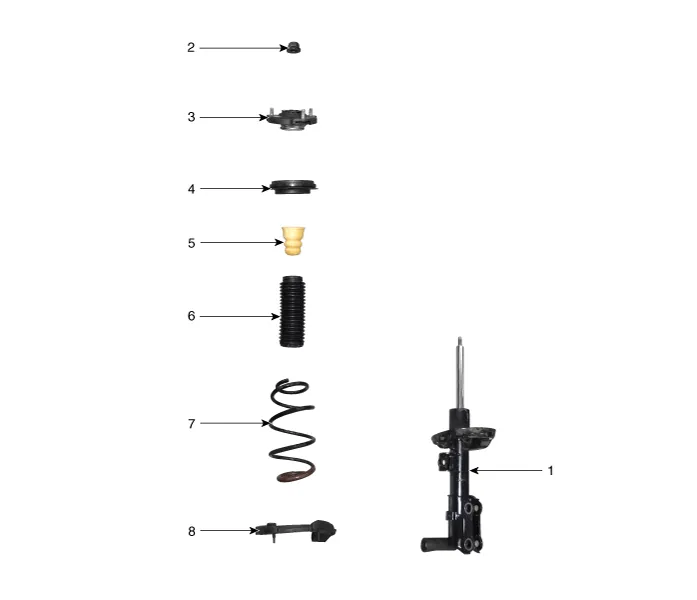 | 1. Strut assembly 2. Lock nut 3. Insulator 4. Strut bearing & Spring upper pad | 5. Bumper rubber 6. Dust cover 7. Coli spring 8. Spring lower pad |