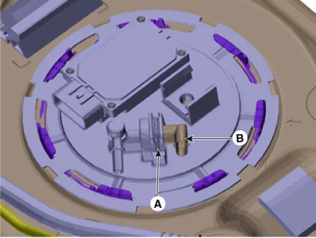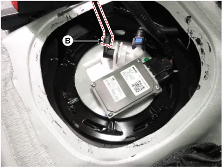 | 4. | Disconnect the fuel pressure sensor connector (B).