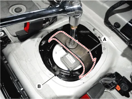 | 7. | Remove the fuel pump locking ring (B) with SST (A) [SST.: 09310-F8100].
