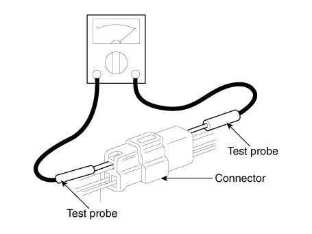 | 11. | When using a circuit tester to check continuity or voltage on connector terminals, insert the test probe into the harness side. If the connector is a sealed connector, insert the test probe through the hole in the rubber cap until contacts the terminal, being careful not to damage the insulation of the wires.