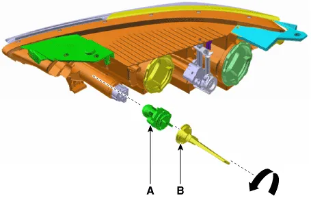 | 4. | Remove the low bulb (A) from the head lamp assembly after turning in the counter clock-wise direction.