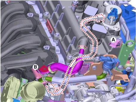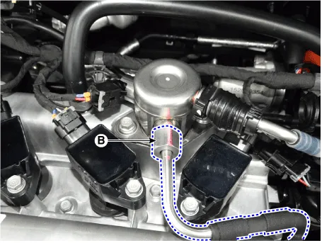 | 5. | Disconnect the fuel feed tube quick-connector (B).