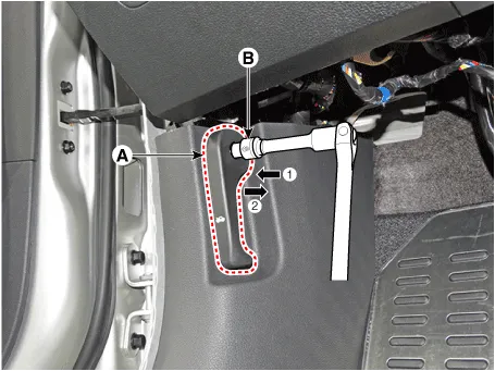 | 1. | Using a socket (B), remove the hood release handle (A).