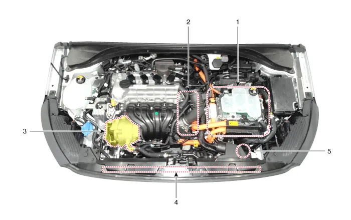 | 1. HPCU (Hybrid Power Control Unit) (LDC+MCU+HCU+Reservoir) 2. Hybrid drive motor | 3. Hybrid starter generator (HSG) 4. Electrical radiator 5. Electric water pump (EWP) |