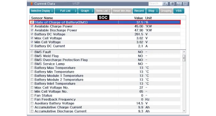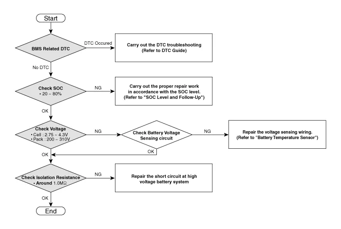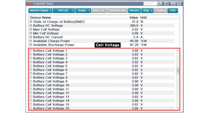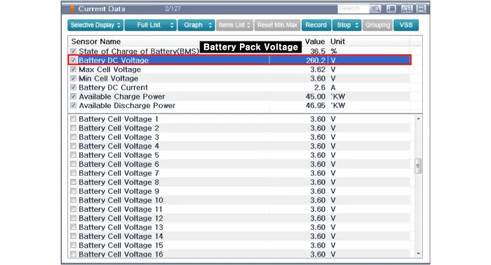 | 3. | Check the cell and pack voltage in GDS service data. Cell Voltage : 2.5 - 4.3V Pack Voltage : 180 - 300V |