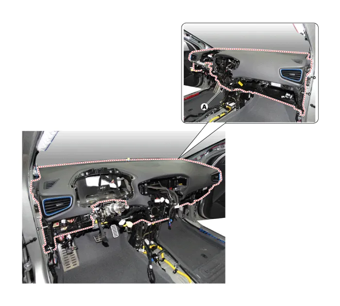 | 21. | Loosen the mounting bolts and nuts and remove the main crash pad assembly (A).