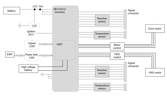Component location1. HPCU (Hybrid Power Control Unit)(LDC+MCU+HCU+Reservoir)2. Hybrid drive motor3. Hybrid starter generator (HSG)4. Electrical radiator5.