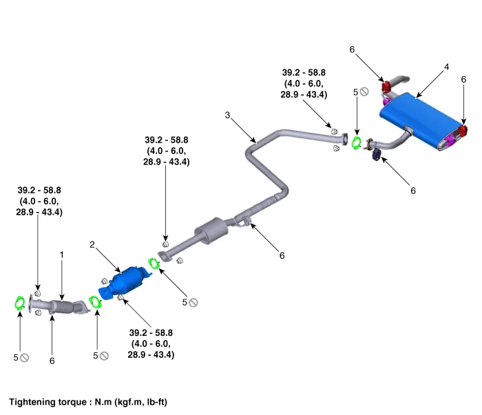 | 1. Front muffler 2. GPF 3. Center muffler | 4. Rear muffler 5. Gasket 6. Hanger |