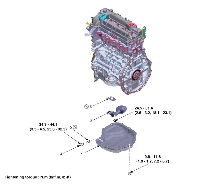 | 1. Oil pan 2. Oil screen 3. Gasket | 4. Drain plug 5. Drain plug gasket |