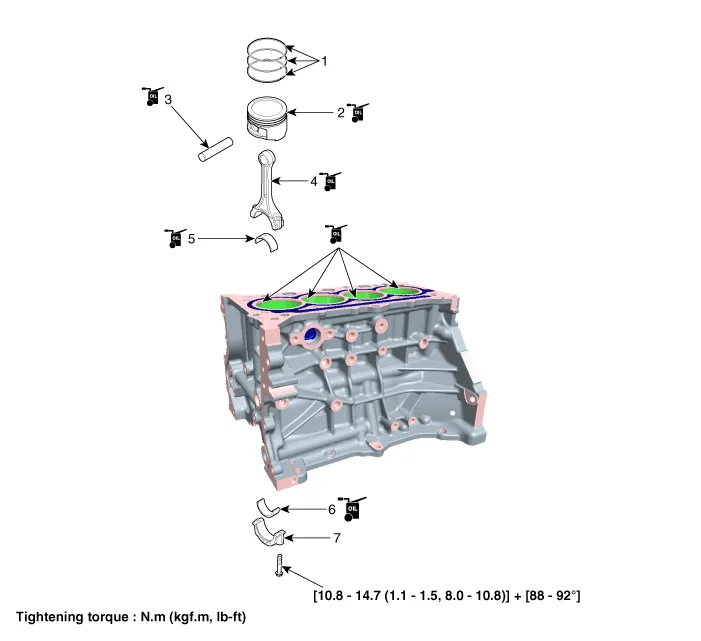 | 1. Piston ring 2. Piston 3. Piston pin 4. Connecting rod | 5. Connecting rod upper bearing 6. Connecting rod lower bearing 7. Connecting rod bearing cap |