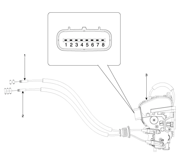 | 1. Door lock/unlock knob cable 2. Door inside handle cable | 3. Door Latch |