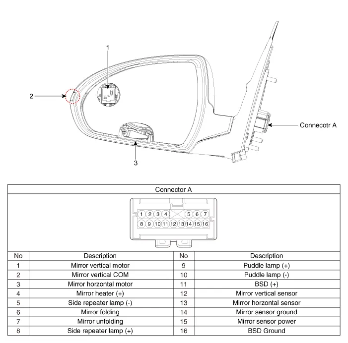 | 1. BSD Indicator 2. Side repeater lamp | 3. Puddle lamp |
