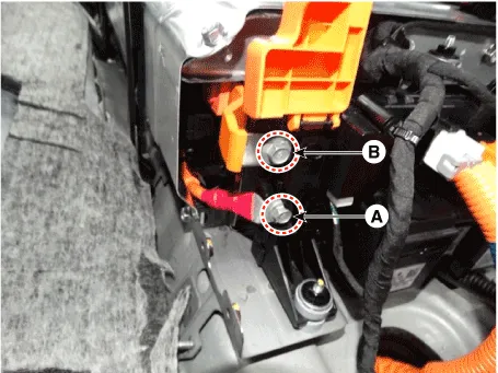 | 7. | Remove the high voltage power cable (+) terminal (A) and (-) terminal (B) after loosening the mounting bolts.