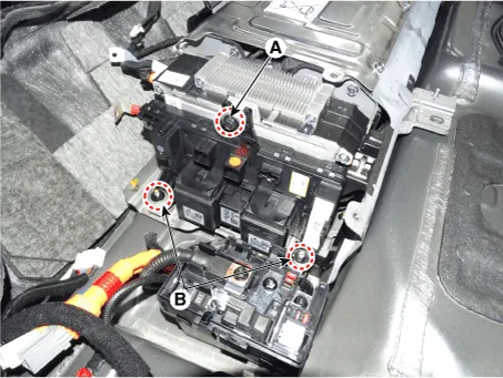 | 10. | Remove the installation bolt (A) and nut (B), then remove the power relay assembly.