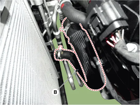 | 3. | Disconnect the radiator upper hose (A) and lower hose (B).