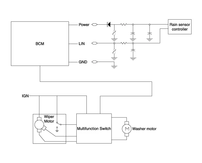 DescriptionIntegrated Rain SensorIntegrated rain sensor (A) controls three systems: front wiper, auto-light, and central air conditioner.1.Wiper Control SystemWhen "AUTO" switch signal is received from the multi-function switch on the right, the integrated rain sensor detects the amount of rainfall.