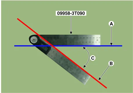 | 8. | Measure the angle (C) between the center line (A) of the angle measuring plate and the horizontal laser beam (B) using a digital protractor (special tool : 09958-3T090).