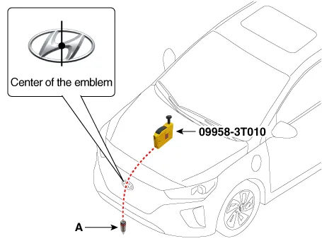 | 2. | Attach a vertical plumb (special tool : 09958-3T010) on the hood, and lower the plumb (A) to the ground so that it passes through the center of the emblem.