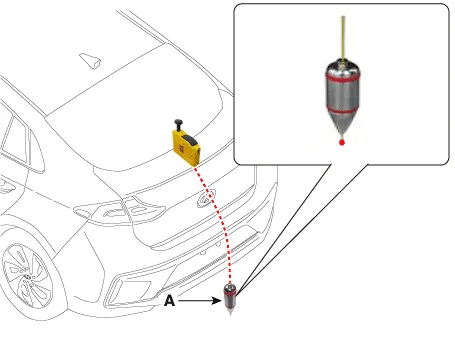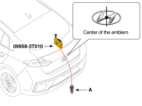 | 4. | Attach a vertical plumb (special tool : 09958-3T010) on the trunk (or tailgate), and lower the plumb (A) to the ground so that it passes through the center of the emblem.