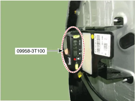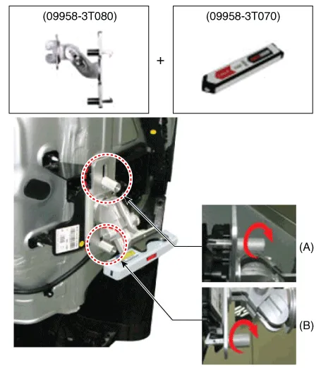 | 7. | Mount the rear corner radar unit fixing adaptor (special tool : 09958-3T080) on the rear corner radar unit and fix the level laser (special tool : 09958-3T070).