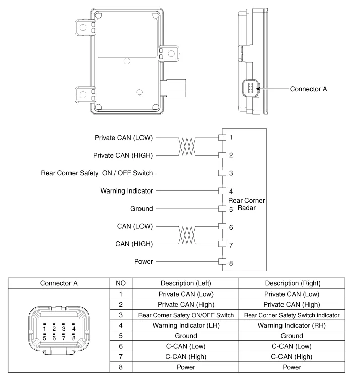 Removal1.Disconnect the negative (-) battery terminal.2.Remove the rear bumper.(Refer to Body - "Rear Bumper")3.Remove the rear corner radar unit (A) after loosening the mounting nuts. • Take care not to separate the bracket from rear bumper when removing the rear corner radar sensor.