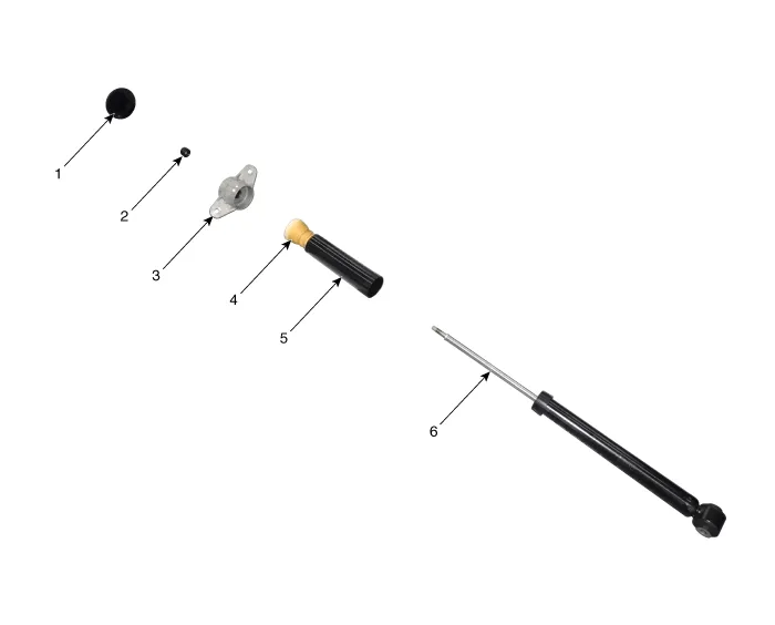 | 1. Shock absorber dust cap 2. Lock nut 3. Insulator assembly | 4. Bumper rubber 5. Dust cover 6. Shock absorber |