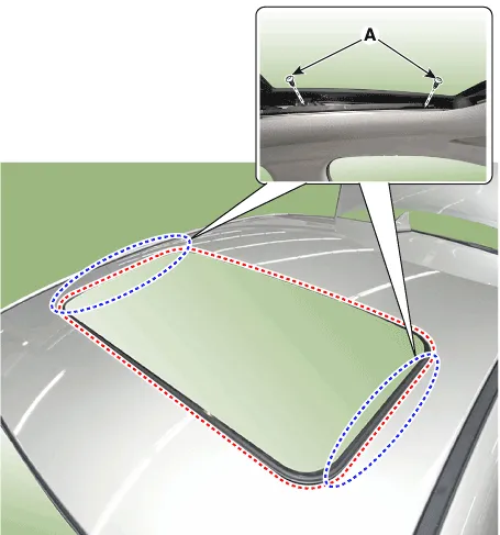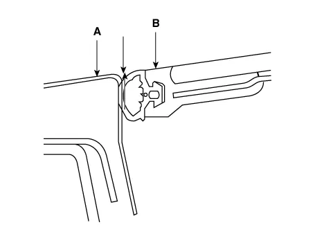 | 1. | Inspect the step height between the roof panel (A) and the glass weatherstrip (B) and then adjust it if necessary.