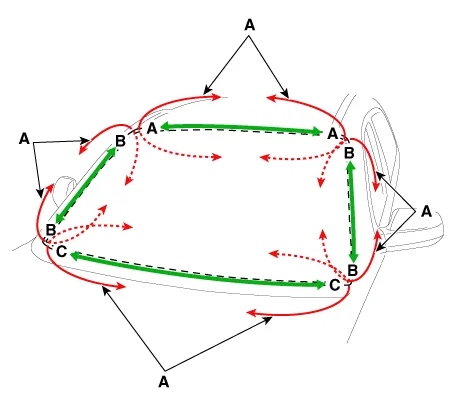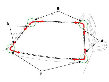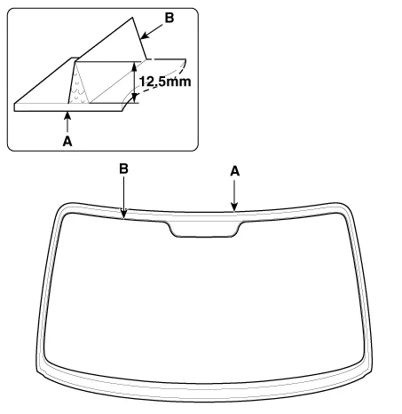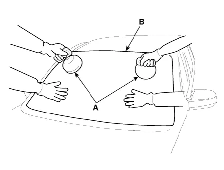 | 5. | Apply a bead of sealant (B) around the windshield glass (A).
