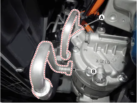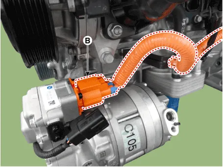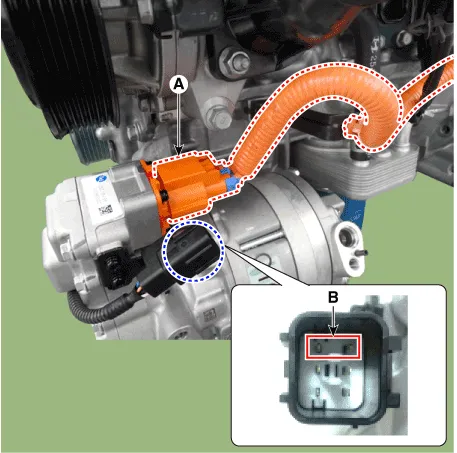 | 6. | Disconnect the high voltage connector (A) and electric compressor connector (B)