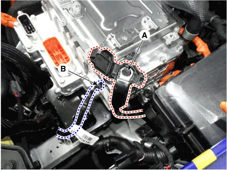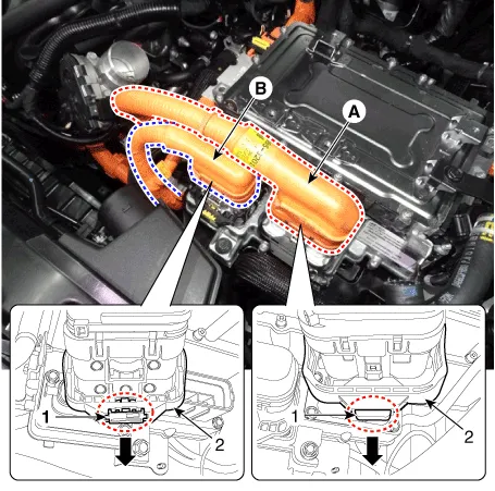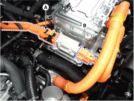 | 7. | Disconnect the power cable (A) [↔ High voltage battery system assembly] and power cable (B) [↔ HSG & Electric A/C compressor].