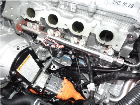 | 4. | Disconnect the rail pressure sensor connector (A), and then remove the sensor (B) from the delivery pipe.