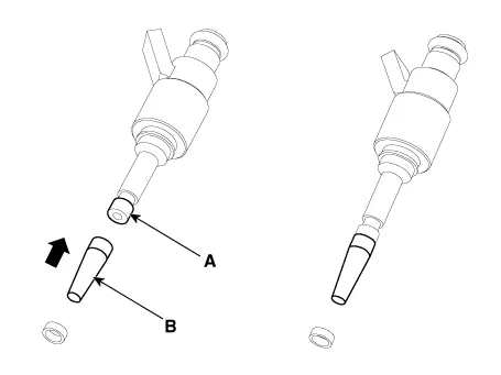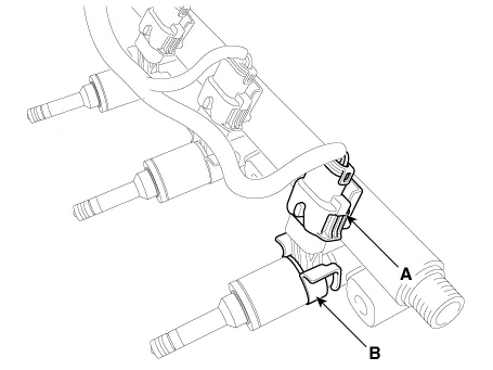 | 4. | Remove the connector (A) and the fixing clip (B), and then separate the injector from the delivery pipe.