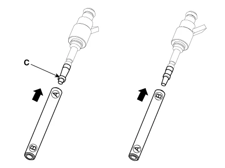 | 3. | Place the seal installing guide (B) (SST No.: 09353-2B000) on the tip of the injector not to damage the injector tip (A). Push the sealing ring (C) with thumb and index finger over the conical assembly tool until it snaps into the groove. The complete assembly must not take longer than 2 to 3 seconds.