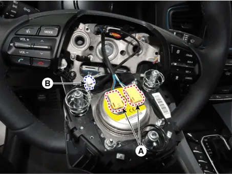 | 4. | Disconnect the airbag module connector (A) and horn connector (B).