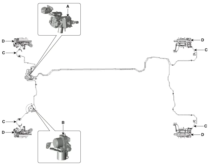 | Brake hoses (C) | Look for damage or signs of fluid leakage. Replace the brake hose with a new one if it is damaged or leaking. |