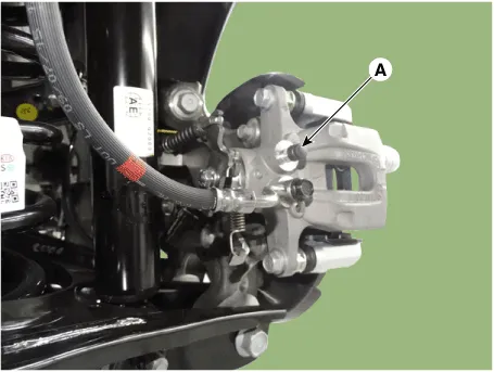 | 3. | Loosen the right-rear brake bleed screw (A) to allow air to escape from the system. Then tighten the bleed screw securely. [Front]