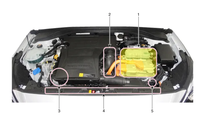 | 1. Reservoir 2. Hybrid drive motor 3. Hybrid starter generator (HSG) | 4. Electrical radiator 5. Electric water pump (EWP) |