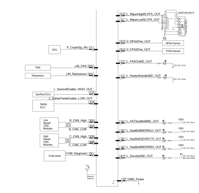 Components NO Connector A Connector B Connector C Connector D 1-Key in switchWiper low relayIGN 1 2-Steering heated switchAuto light groundIG2 Steering heated power 13Rear left seat belt indicator-PAS ON IndicatorIG2 Steering heated power 24Passenger seat belt indicator-Steering heated indicatorIG2 Steering heated power output5Rear centor seat belt indicator--Room lamp6Rear right seat belt indicator-COMGround7--Crash outputPower8-PAS InputCrash output-9Mirror unfolding relayKey inter lock switchAuto light sensor-10-Sunroof open switch NTC SensorRPAS Power11-PAS ON SwitchHead lamp switch (High)FPAS Power12-Multifunction switch groundWiper int vol relayGround signal13Key solenoid-Front wiper switch14--foglamp switch15ATM solenoid output-Wiper relay (High)16--Auto light (Power)17Security indicator-Sunroof enable (High)18Poket lamp output--19Safety powerwindow down (Low)C-Can (Low)-20Key hole illuminationC-Can (High)-21-B-CAN (Low)Front wiper low backupswitch22-B-CAN (High)NTC Ground23 Mirror folding relay output-IGN 124--ACC25PAS-26-Front wiper washer switch27-Blade position28Defogger switchBrake switch29-30-31-32-